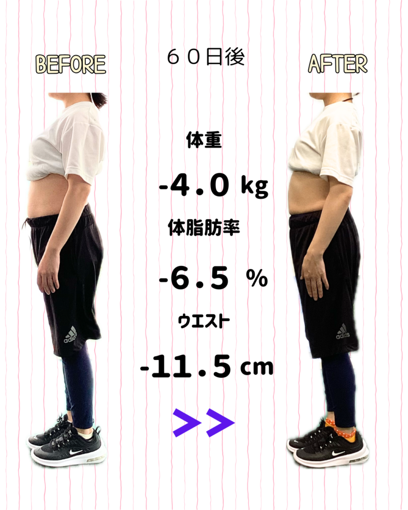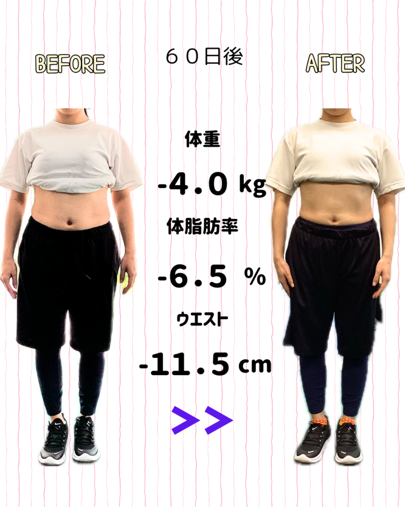 Remakeのダイエットメソッドでトレーニングと食事管理を実施していただき、60日間でどれくらい体の変化が出るかを追わせていただくこのコース